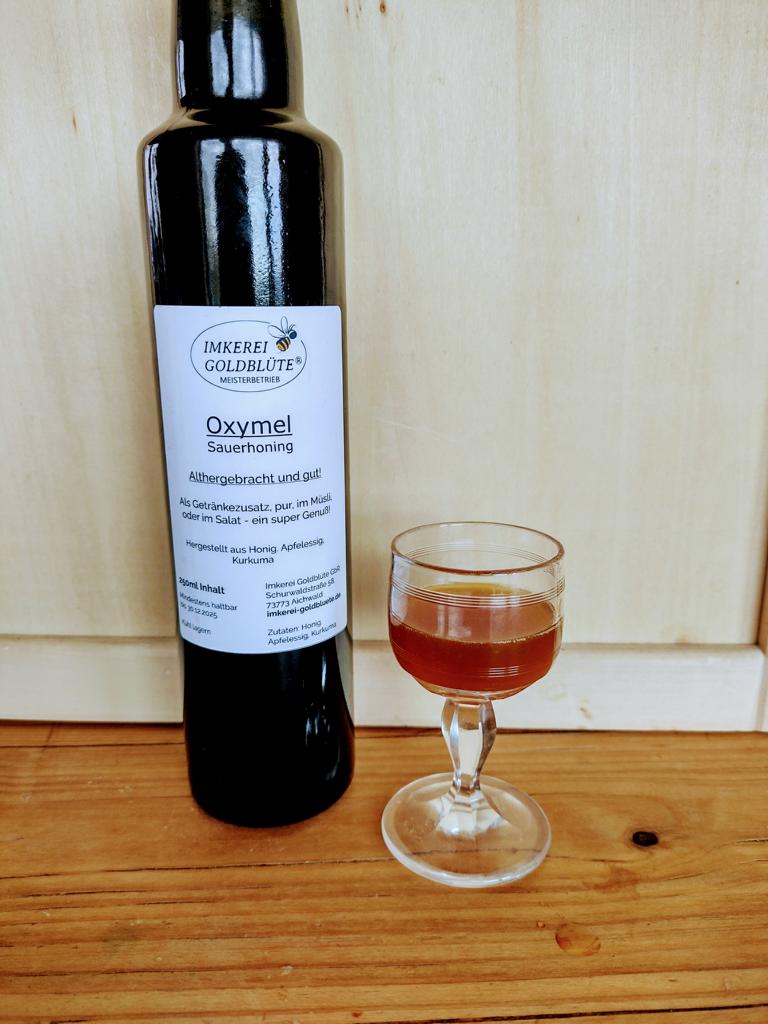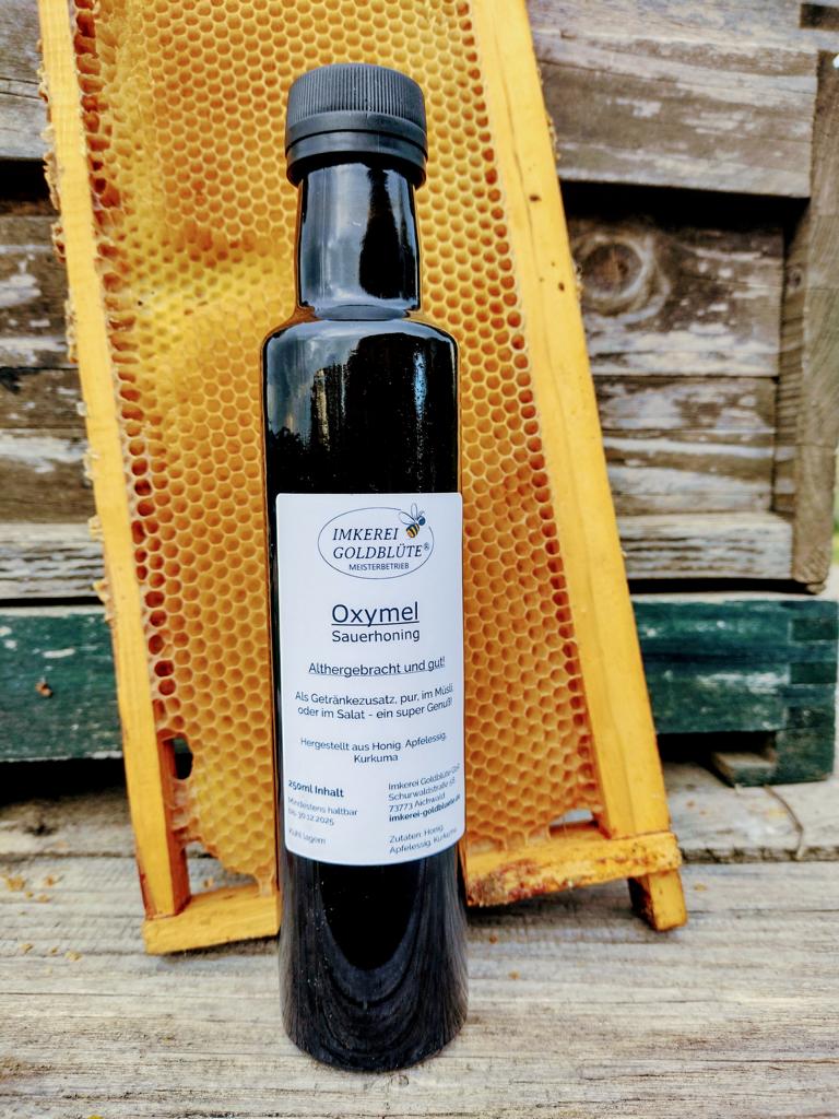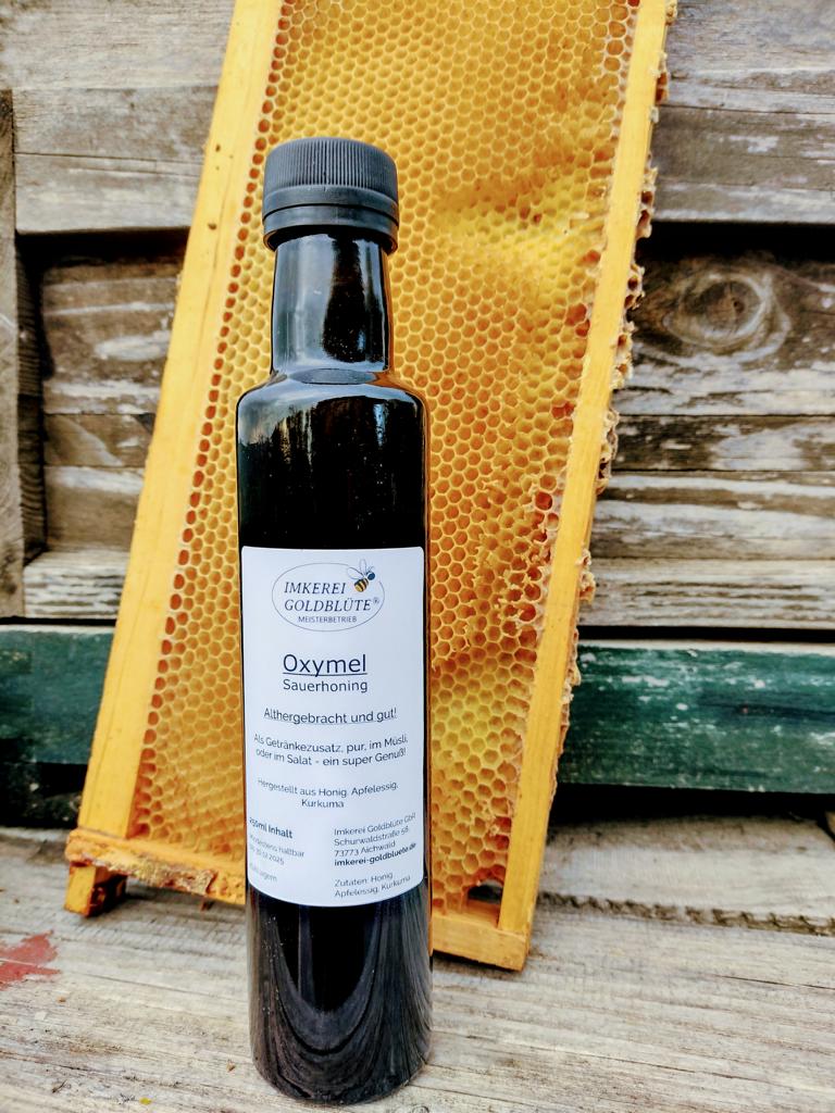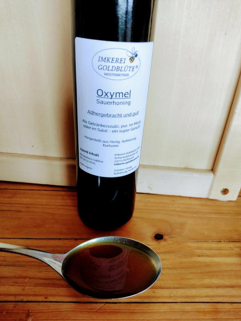Oxymel wird in der Umgangssprache auch Sauerhonig genannt und ist, wie der Name schon sagt eine Mischung aus Honig(mel) und Essig („oxy). Einfach Oxymel.