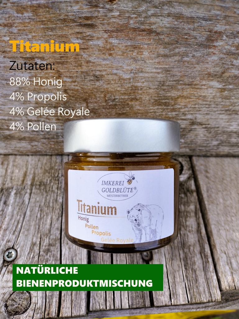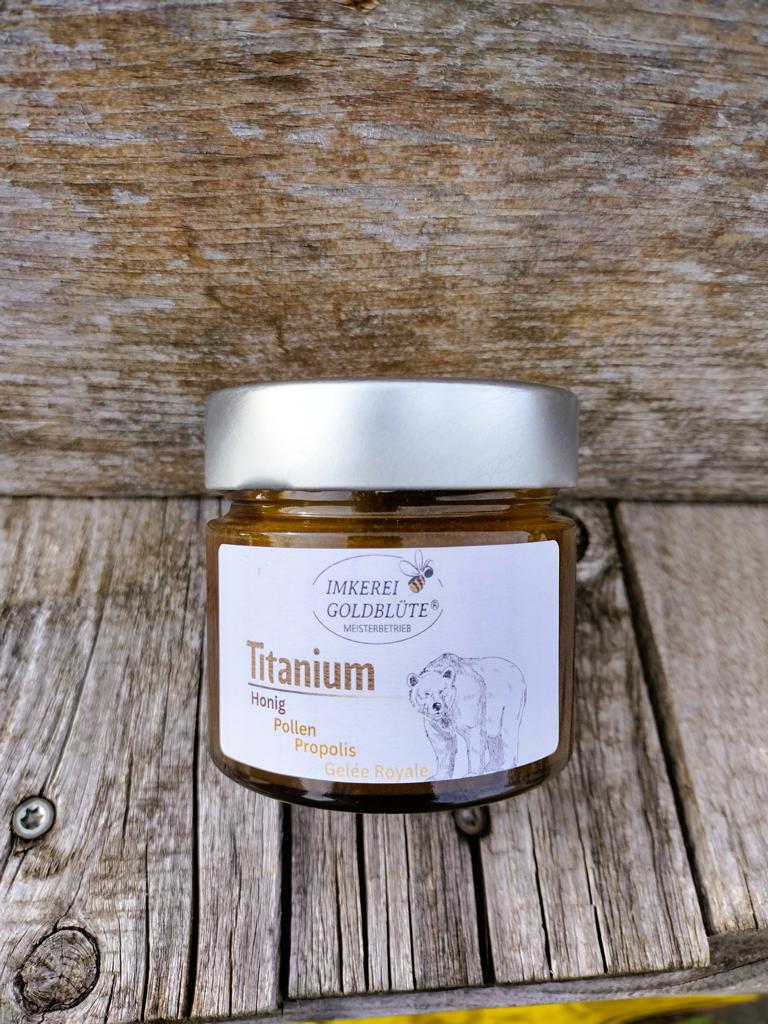 Bei unserem Titanium mischen wir ja Blütenpollen, Propolis und Gellée Royale in größeren Mengen zu, als es natürlicherweise im Honig vorkommt. Deshalb wir dunser Titanium rechtlich vom Honig zu einer Honigzubereitung. Das Gleiche gilt übrigens auch bei Honig mit Nüssen, oder für unsere Schoko-Nuss-Honigzubereitung.